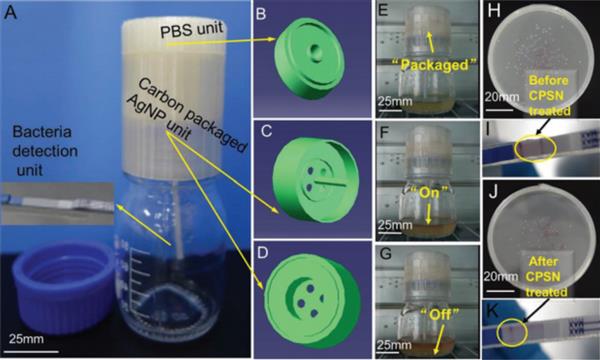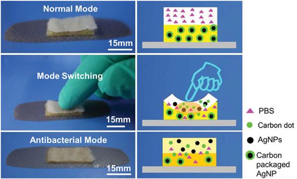智能繃帶中含有銀納米顆粒(AgNPs),這些顆粒被包裹在一層碳里,位于一層磷酸鹽緩沖鹽溶液(PBS)下方。使用者只需按壓繃帶,就會導致層層互動,釋放出抗菌的銀顆粒。