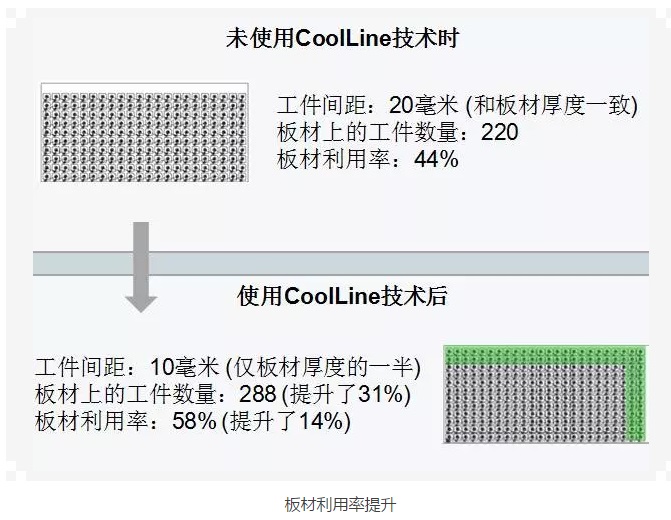 為了避免板材上的局部過熱問題,往往采取的傳統(tǒng)措施是在排版時保持工件之間有較大的間距。但運用了CoolLine水霧冷卻技術(shù)后,一切都變得大不相同。相比以往,您可以把工件排版得更加緊密,從而更高效地利用金屬板材。如上圖的案例所示(板材為2000 mm x 1000 mm,厚度為20 mm的碳鋼板),CoolLine技術(shù)可以使相同面積板材上所能容納工件的數(shù)量提升31%!