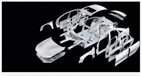 在門檻型材、立柱部件和車頭防撞結(jié)構(gòu)件使用高強(qiáng)度鋼,前懸塔頂和發(fā)動(dòng)機(jī)艙部分結(jié)構(gòu)采用鑄鋁和壓鋁制造,車頂、發(fā)動(dòng)機(jī)蓋和前翼子板都將采用鋁合金制成。