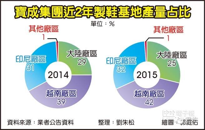 現(xiàn)在的寶成,有員工41萬(wàn)人,分布在中國(guó)、越南、印尼三大廠區(qū)。就產(chǎn)量份額來(lái)說(shuō),2015年中國(guó)的比例已經(jīng)是三大廠區(qū)中最小的一塊了,只剩下越南的一半左右。