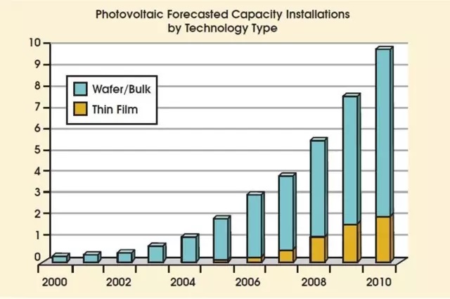 在上世紀中期,貝爾實驗室發(fā)明“貝爾太陽能電池”,但是其昂貴的成本限制了太陽能電池行業(yè)的發(fā)展,即使此后經過55年,光伏太陽能電池的發(fā)電量在全球電網中也只占大約0.04%。然而,形勢在近幾年發(fā)生了變化,從平板顯示和半導體行業(yè)衍生出來的激光加工技術使太陽能行業(yè)出現(xiàn)了爆發(fā)式的增長。