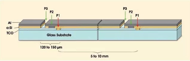 薄膜電池的刨面圖, P1, P2P3通過劃線來實現(xiàn)電路連接,TCO=Transparent Conductive Oxide