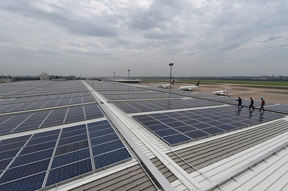 在今年6月21日,杭州蕭山國(guó)際機(jī)場(chǎng)貨站屋頂所安裝的2.3MW分布式太陽(yáng)能發(fā)電系統(tǒng)正式落成投產(chǎn)。該系統(tǒng)估計(jì)每日可發(fā)電8,500度,且已并入國(guó)家電網(wǎng)。