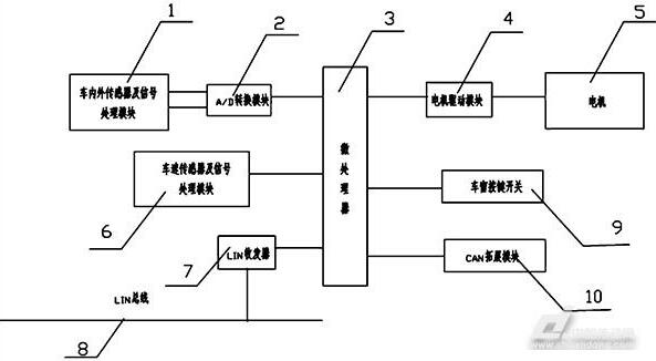 新能源汽車車身智能控制模塊,包括微處理器、A/D轉(zhuǎn)換模塊,車內(nèi)外傳感器及信號處理模塊、車速傳感器及信號處理模塊、電機(jī)驅(qū)動模塊、電機(jī)、車窗按鍵開關(guān)、LIN收發(fā)器及LIN總線以及CAN拓寬模塊。其中車內(nèi)外傳感器及信號處理模塊通過A/D轉(zhuǎn)換模塊與微控制器交換信號,所述微處理器對車速傳感器及信號處理模塊、車窗按鍵開關(guān)提供的信號進(jìn)行反饋處理;所述微處理器通過電機(jī)驅(qū)動模塊對電機(jī)進(jìn)行控制,所述微處理器通過LIN收發(fā)器將信號傳遞到LIN總線上。采用LIN作為控制總線,有效節(jié)約了成本;可以根據(jù)車速及車內(nèi)外溫差調(diào)整車窗升降的速度,避免因驟開驟降導(dǎo)致的車內(nèi)不穩(wěn)定。
