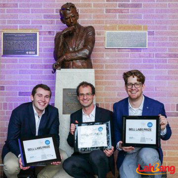 慕尼黑工業(yè)大學(xué)研究人員(從左到右)Fabian Steiner, Georg Böcherer, 和Patrick Schulte與信息論之父克勞德香農(nóng)(Claude Shannon)的雕像合影。
