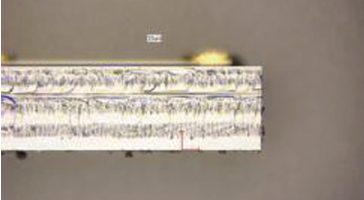 幾年前,德龍激光通過核心技術(shù)團隊技術(shù)攻關(guān),成功研發(fā)出了激光應(yīng)力誘導(dǎo)切割技術(shù),并申請了專利,將該技術(shù)應(yīng)用于藍寶石、玻璃、硅、SiC等多種材料的切割。激光應(yīng)力誘導(dǎo)切割主要原理是將短脈沖激光光束透過材料表面聚焦在材料中間,在材料中間形成改質(zhì)層,然后通過外部施加壓力使芯片分開。中間形成的改質(zhì)層如圖1所示: