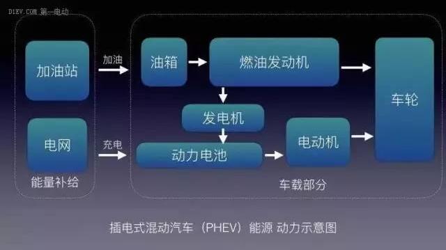Plug-in Hybrid Electric vehicle,即插電式混合動(dòng)力汽車。顧名思義,比起HEV,PHEV的車載動(dòng)力電池可以通過(guò)插座進(jìn)行充電。能量提供由電池和燃油提供。動(dòng)力提供由燃油發(fā)動(dòng)機(jī)和電動(dòng)機(jī)提供。