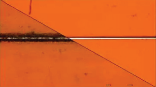 圖1:CO2激光(左)與 UV 激光(右)的切割槽比較。UV 激光產(chǎn)生熱效應(yīng)較小,其切割邊沿干凈、整齊。