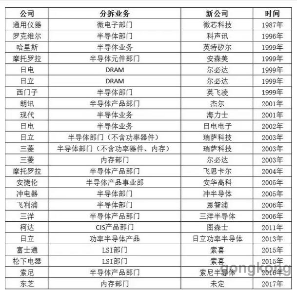 圖1:全球部分綜合性IDM公司半導(dǎo)體業(yè)務(wù)分拆情況