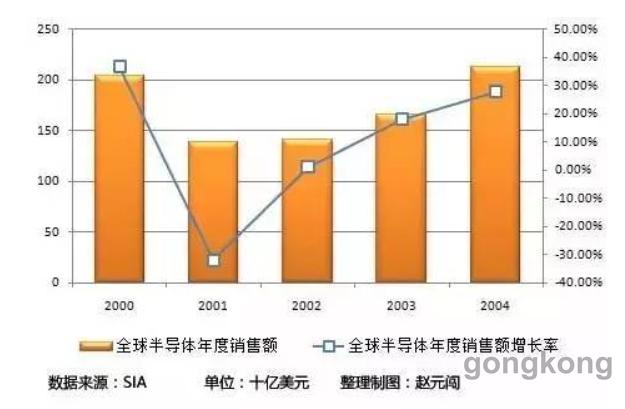 20世紀(jì)90年代隨著互聯(lián)網(wǎng)的到來,改變了人類對以往科技的認(rèn)知,互聯(lián)網(wǎng)公司如雨后春筍般涌現(xiàn),加上資本市場的瘋狂追逐,最終在千禧年后,互聯(lián)網(wǎng)泡沫破裂,一切回歸平靜, 2000年的全球半導(dǎo)體銷售額增長率達(dá)到37%(從1986年以來的第二高的增長率),突破2000億美元關(guān)口。但隨著泡沫的破裂,2001年出現(xiàn)了斷崖式的下降,全球半導(dǎo)體出現(xiàn)了30%的驚人降幅,甚至在往后的三年都處于低迷期,直到2004年全球半導(dǎo)體市場才開始恢復(fù)增長。