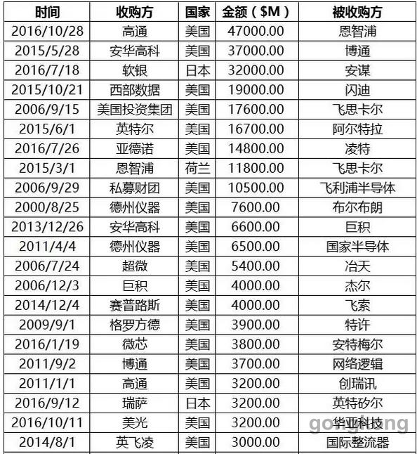 從表6中可以看出,全球半導(dǎo)體產(chǎn)業(yè)20億美元收購案中,前四大金額都出現(xiàn)在該時期,高通2016年10月宣布470億美元(一說是390億美元,不管是哪個數(shù)字,都是第一大)收購恩智浦,安華高科2015年5月370億美元收購博通,軟銀320億美元收購安謀,西部數(shù)據(jù)190億美元收購閃迪。