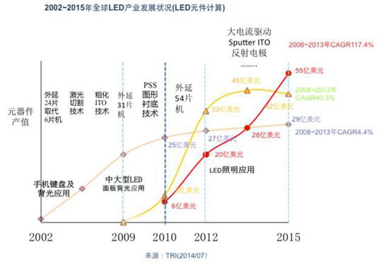 這幾年基本上是中國臺灣在控制周期的節(jié)奏,模仿再創(chuàng)新的鼻祖其實(shí)是臺灣的LED廠家,透過海歸與工研院的技術(shù)融合,臺灣開始取得技術(shù)的突破,讓LED開始在一個個應(yīng)用領(lǐng)域滲透。這個時期我認(rèn)為是技術(shù)驅(qū)動市場的,技術(shù)主導(dǎo)LED周期。