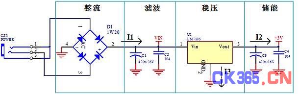 從圖上可知,線性電源有整流、濾波、穩(wěn)壓、儲能等功能元件組成,同時(shí),一般用的線性電源為串聯(lián)穩(wěn)壓電源,輸出電流等于輸入電流,I1=I2+I3,I3是參考端,電流很小,因此I1≈I3。我們?yōu)槭裁匆v電流,是因?yàn)镻CB設(shè)計(jì)時(shí),每條線的寬度不是隨便設(shè)的,是要根據(jù)原理圖里元件節(jié)點(diǎn)間的電流大小來確定的(請查《PCB設(shè)計(jì)銅鉑厚度、線寬和電流關(guān)系表》)。電流大小、電流流向要搞清楚,做板才恰到好處。