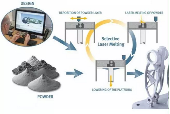 使用高功率激光束將一層金屬粉末加工熔合成型,完成熔合后,操作平臺下調(diào)一個層厚的距離,繼續(xù)加工下一層粉末,重復此步驟,直至劃定(選定的需要加工)的區(qū)域全部熔鑄完成,就得到一件立體的化合物。所需的產(chǎn)品(零件)就是這樣通逐層加工累積而成。