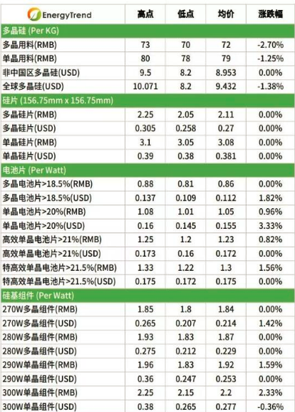 本周組件市場(chǎng)呈現(xiàn)大陸國(guó)內(nèi)放緩但海外持續(xù)拉貨兩種對(duì)比,中國(guó)的終端市場(chǎng)僅剩領(lǐng)跑者計(jì)劃的收尾,市場(chǎng)已準(zhǔn)備進(jìn)入假期,因此市場(chǎng)需求逐漸走緩漸弱。海外依舊有部分區(qū)域持續(xù)裝機(jī)交貨,供需算是穩(wěn)定。目前國(guó)內(nèi)一般多晶(270W~275W)組件價(jià)格維持在1.80~1.85RMB/W,高效多晶(280~285W)組件價(jià)格維持在1.83~1.93RMB/W。一般單晶(290~295W) 組件價(jià)格維持在1.83~1.96RMB/W,均價(jià)上揚(yáng)至1.92RMB/W。高效單晶(300~305W) 組件價(jià)格上揚(yáng)至2.15~2.30RMB/W,均價(jià)上揚(yáng)至2.25RMB/W。特高效單晶(>310W) 組件價(jià)格維持在2.25RMB/W以上的價(jià)位。海外一般多晶組件價(jià)格維持在0.207~0.265USD/W,均價(jià)小幅上揚(yáng)至0.214USD/W。高效多晶組件價(jià)格維持在0.212~0.275USD/W。一般單晶組件價(jià)格維持在0.247~0.360USD/W,高效單晶組件價(jià)格維持在0.265~0.380USD/W,均價(jià)小幅上揚(yáng)至0.277USD/W。