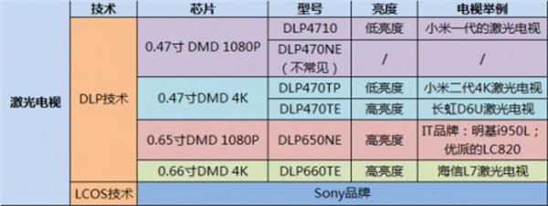 激光電視與液晶電視一樣,無(wú)一例外需要芯片的支撐才是質(zhì)量的保障。芯片的選擇上,幾乎所有激光電視是使用DLP技術(shù)的DMD芯片,它主要分為四個(gè)尺寸:0.47寸DMD 1080P,0.47寸DMD 4K,0.65寸DMD 1080P和0.66寸DMD 4K,不同芯片的型號(hào)也決定了投影的性能。