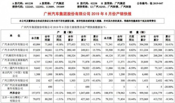 撰文 | 李曉瑞編輯 | 陳楚出品 | 汽車K線7月5日,廣汽集團(tuán)(SH:601238)發(fā)布6月產(chǎn)銷快報(bào),今年期中考試成績(jī),隨之公布于眾。數(shù)據(jù)