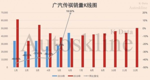從銷量K線圖不難發(fā)現(xiàn),從1月44.64%的降幅到6月18.92%的增幅,廣汽傳祺銷量下滑的速度在收窄,而這條代表銷量增速的線條也呈現(xiàn)著上揚(yáng)態(tài)勢(shì)。
