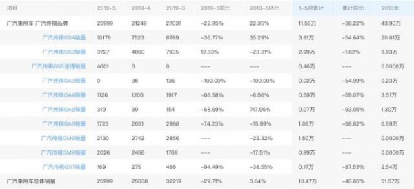 其中,傳祺GS4前5個(gè)月的銷量為3.81萬(wàn)輛,同比下滑54.64%;傳祺GS3銷量為2.99萬(wàn)輛,同比下滑1.62%;傳祺GA8銷量為1.06萬(wàn)輛,同比下滑68.82%......