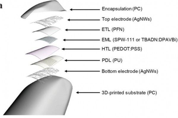 兩階段3D打印過程可以創(chuàng)建任何形狀的OLED屏幕,并嵌入到任何形狀的透明(或不透明)3D框架中 韓國延世大學材料科學與工程團隊開