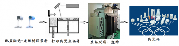 激光固化陶瓷–光敏樹脂漿料后,形成3D陶瓷生坯件,然后經(jīng)脫脂與高溫燒結(jié),構(gòu)成陶瓷件。