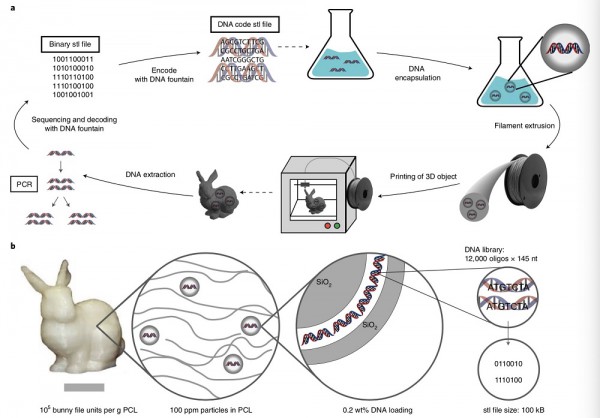 以色列計(jì)算遺傳學(xué)家亞尼夫·埃爾利赫和羅伯特·格拉斯等人,開發(fā)了“萬物DNA”存儲(chǔ)架構(gòu),它可以生成具有不變記憶的材料。為了檢驗(yàn)這一方法,他們將常見的計(jì)算機(jī)圖形測試模型“斯坦福兔子”的藍(lán)圖編碼為DNA兼容格式,再將其存儲(chǔ)在DNA分子中,進(jìn)而將DNA分子封裝在二氧化硅小球內(nèi),將小球嵌入可生物降解的熱塑性聚酯中,最后使用所得的熱塑性聚酯3D打印了“兔子”。