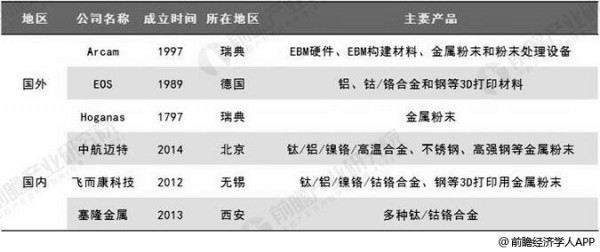 國內外主要金屬3D打印材料供應商統計情況