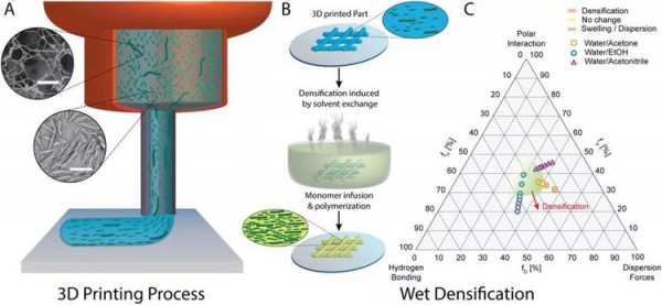 蘇黎世聯(lián)邦理工學(xué)院A.R. Studart教授課題組將3D打印技術(shù)與濕法致密化工藝相結(jié)合,極大提高了材料中纖維素的濃度,3D打印復(fù)合材料顯示出了高度有序的微觀結(jié)構(gòu)和顯著增強(qiáng)的機(jī)械性能,其性能明顯高于已報(bào)道的3D打印纖維素基材料。相關(guān)工作以“Complex-Shaped Cellulose Composites Made by Wet Densification of 3D Printed Scaffolds”為題,發(fā)表于《先進(jìn)功能材料》上。復(fù)合材料的制備過程研究人員采用兩步法來制備具有高納米纖維濃度的復(fù)雜結(jié)構(gòu)復(fù)合材料:首先打印具有高度有序微觀結(jié)構(gòu)的纖維素支架,隨后是通過溶劑置換過程對打印支架進(jìn)行濕致密化(圖1)。所打印的油墨由纖維素納米晶與纖維素兩部分組成,研究人員引入盡可能高的纖維素納米晶來實(shí)現(xiàn)打印支架中纖維素的濃度最大化,擠出過程則使得纖維素納米晶定向排列(圖1A);隨后,將打印物體浸入選定成分的溶劑浴中,使纖維素支架致密化(圖1B),當(dāng)溶池中的液體是纖維素的不良溶劑時(shí),會導(dǎo)致纖維素之間相互吸引,實(shí)現(xiàn)致密化;研究人員還利用文獻(xiàn)報(bào)道的Hansen溶解度參數(shù)來評估了相應(yīng)的溶劑量(圖1C)。