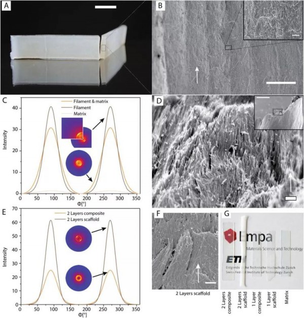 圖2. 使用不同混合溶劑獲得的纖維素支架的固體含量復(fù)合材料和力學(xué)性能將經(jīng)過濕法致密化處理的3D打印納米纖維素制件進(jìn)一步加工成含有高濃度纖維素的復(fù)合材料。在纖維素支架中引入聚合物相來制備復(fù)合材料:先對打印材料超臨界干燥處理,再以單體滲透打印材料。3D打印后進(jìn)行濕法致密化可以保留纖維素納米晶和納米纖維的定向排列(圖3A,B);廣角X射線衍射驗(yàn)證了纖維素沿打印方向的高度有序排列,掃描電鏡照片也進(jìn)一步觀察到了纖維素的取向結(jié)構(gòu)(圖3C–F)。由于所選的聚合物具有與纖維素納米顆粒相似的折射率,最終可獲得透明的復(fù)合材料(圖3G)。