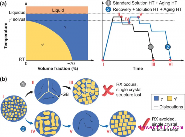 高溫合金的標(biāo)準(zhǔn)熱處理制度一般由固溶、時(shí)效組成。實(shí)踐證明該工藝流程會(huì)導(dǎo)致3D打印高溫合金發(fā)生再結(jié)晶。經(jīng)過系統(tǒng)的文獻(xiàn)調(diào)研與綜合分析,作者們提出并證實(shí)在固溶前增加“回復(fù)”(Recovery)步驟,可以消除再結(jié)晶驅(qū)動(dòng)力。經(jīng)過“回復(fù)-固溶-時(shí)效”處理,先是高溫合金的殘余應(yīng)力伴隨微觀組織γ′相的定向粗化而消除,且位錯(cuò)密度可降低至熱處理前的5%左右,時(shí)效后沉淀強(qiáng)化γ′相達(dá)到與鑄態(tài)基材相同水平。因所發(fā)現(xiàn)的現(xiàn)象與高溫合金在高溫蠕變條件下發(fā)生的筏化效應(yīng)(Rafting)相似,且在事實(shí)上起到了回復(fù)的效果,故將其命名為“筏化-回復(fù)”效應(yīng)(Rafting-enabled recovery)。此發(fā)現(xiàn)突破了經(jīng)典觀念所認(rèn)為的“單晶高溫合金不具備回復(fù)能力”的認(rèn)知,為設(shè)計(jì)3D打印高溫合金的非標(biāo)準(zhǔn)熱處理制度提供了科學(xué)依據(jù),并表明新的熱處理制度完全能滿足3D打印單晶葉片修復(fù)的需求。
