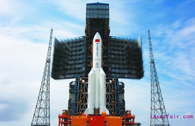 在發(fā)射塔上整裝待發(fā)的長征五號(hào)B火箭。史嘯 攝
