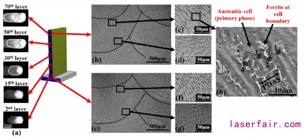 現(xiàn)有的文獻(xiàn)大都以增材制造的產(chǎn)品同傳統(tǒng)工藝進(jìn)行對(duì)比,其性能幾乎相當(dāng)。然而增材制造產(chǎn)品的組織和性能頗受關(guān)注,這是因?yàn)樵摴に嚧嬖趶?fù)雜的熱歷史過(guò)程。Hederick在綜述中指出,研究熱歷史和組織演變的關(guān)系至關(guān)重要。許多研究工作多集中在認(rèn)知熱循環(huán)對(duì)顯微組織和性能的研究上。在LMD工藝中熱歷史過(guò)程包括快速加熱和快速冷卻過(guò)程以及一定的溫度梯度。這對(duì)顯微組織的影響非常重要,進(jìn)而會(huì)影響到最終的機(jī)械性能。Yadollahi等人報(bào)道了工藝參數(shù)會(huì)影響熔池的動(dòng)力學(xué)。進(jìn)而影響熱歷史。工藝參數(shù)會(huì)影響到缺陷的生成。同時(shí)研究了層層之間的間隙對(duì)機(jī)械性能和顯微組織的影響。結(jié)果顯示較長(zhǎng)的時(shí)間間隙導(dǎo)致高的冷卻速率,從而顯微組織較細(xì)小。SU等人研究了結(jié)構(gòu)類型(常用的有兩種:薄壁墻和塊體)的組織變化。薄壁墻結(jié)構(gòu)存在柱狀晶且平行于制造方向,而塊體試樣的組織則呈現(xiàn)多個(gè)方向。但目前對(duì)激光送絲來(lái)說(shuō),公開(kāi)報(bào)道還比較少。