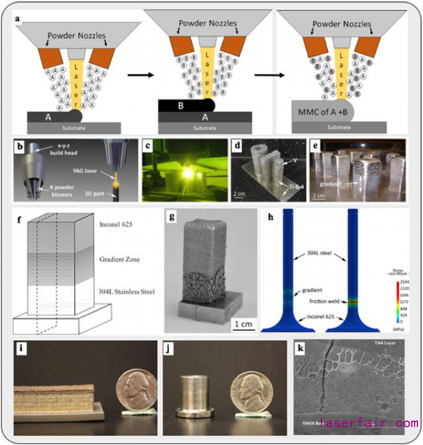 多材料打印時(shí)展現(xiàn)出來的獨(dú)特的魅力,不僅可以將兩種不同的材料實(shí)現(xiàn)100%的混合,同時(shí)實(shí)現(xiàn)設(shè)計(jì)結(jié)構(gòu)件性能的均一性。這一理念導(dǎo)致了打印In718 和GRCoP-84復(fù)合材料,這是一種無磁性和有磁性的不銹鋼,Nb在Ti6Al4V中混合比例不同等,如圖3。多材料打印還可以通過添加不同的物相而改變金屬的性質(zhì),如二次金屬強(qiáng)化相。而且通過控制不同的添加量,還可以控制產(chǎn)品的性能。
