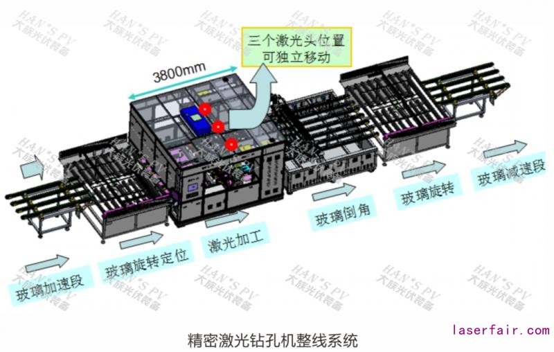 該整線系統(tǒng)設(shè)備包含加速段、旋轉(zhuǎn)定位、激光鉆孔、玻璃圓孔倒角、旋轉(zhuǎn) 、減速段等,可采用橫豎兩種方式進料;設(shè)備可實現(xiàn)高精度、高效率、低成本的連續(xù)生產(chǎn);激光鉆孔機擁有三頭切割工位,可實現(xiàn)孔位置精度達±0.5mm,孔位誤差穩(wěn)定在±0.5mm,崩邊小于或等于0.3mm,三孔激光鉆孔加工時間(φ2.0mm)小于7s。