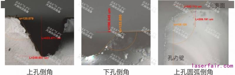 上圖是以50X放大觀察最大崩邊。激光鉆孔未形成錐度孔、孔內(nèi)壁干凈、基本無粉塵殘留,其中激光出射面孔崩邊在50μm左右,激光入射面孔崩邊小于200μm。