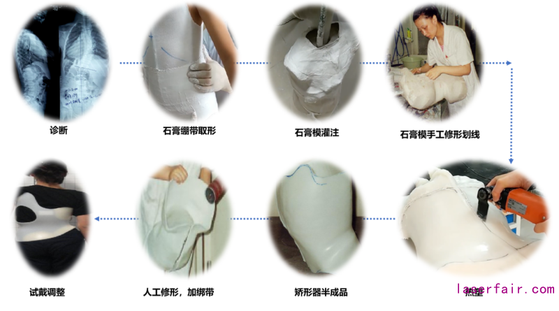 傳統(tǒng)矯形器制作需要先制作患者身體石膏模,再根據(jù)石膏模型進(jìn)行矯形器翻模制作,后期修形打磨,存在著變形大、固定點(diǎn)不準(zhǔn)確、制作工作環(huán)境差等問(wèn)題。