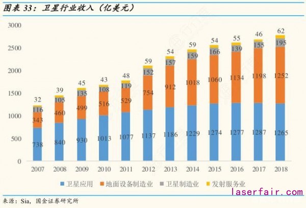 據(jù)美國(guó)衛(wèi)星工業(yè)協(xié)會(huì)(SIA)數(shù)據(jù)顯示,2018年衛(wèi)星行業(yè)產(chǎn)值為2774億美元,其中子板塊衛(wèi)星應(yīng)用產(chǎn)值1265億美元、地面設(shè)備制造1252億美元,兩者合計(jì)占比超90%。另衛(wèi)星制造產(chǎn)值195億美元,衛(wèi)星發(fā)射62億美元,占比約10%。
