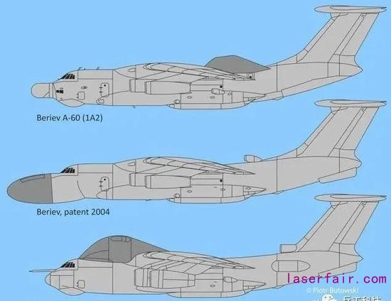 其次,從設(shè)計(jì)上看,新的機(jī)載激光武器結(jié)構(gòu)布局也發(fā)生了巨大變化,這表明其內(nèi)部設(shè)計(jì)也有了很大的不同,屬于全新的設(shè)計(jì),并非A-60計(jì)劃的簡單延續(xù)和模仿。A-60技術(shù)驗(yàn)證機(jī)的發(fā)射系統(tǒng)位于機(jī)鼻,瞄準(zhǔn)鏡則安裝在機(jī)身脊背上設(shè)置改裝的大型整流罩下;別里耶夫設(shè)計(jì)局新的設(shè)計(jì)則完全不同。根據(jù)別里耶夫設(shè)計(jì)局公布的專利圖紙來看,2004年版本的設(shè)計(jì)方案中,已經(jīng)將A-60上分置設(shè)計(jì)的發(fā)射系統(tǒng)和瞄準(zhǔn)鏡集成于一體,放置在機(jī)鼻處,發(fā)射系統(tǒng)和瞄準(zhǔn)鏡集成一體,代表著俄羅斯機(jī)載激光武器系統(tǒng)設(shè)計(jì)和器件水平的進(jìn)步;而在2020年最新版方案中,發(fā)射系統(tǒng)和瞄準(zhǔn)鏡依舊一體化設(shè)計(jì),但卻改為布置在機(jī)頭駕駛艙后方的機(jī)身上部,就像公牛脖子上隆起的包一樣。之所以如此設(shè)計(jì),估計(jì)是因?yàn)槠湓O(shè)計(jì)中的攔截和射擊目標(biāo)均來自于載機(jī)飛行航線的上方,所以這種設(shè)計(jì)便于攔截瞄準(zhǔn)攻擊上方的高空目標(biāo)比如導(dǎo)彈等。僅從設(shè)計(jì)方案來看,別里耶夫設(shè)計(jì)局拿出的新方案既不是A-60方案的簡單延續(xù)和重復(fù),也非對美國ABL載機(jī)方案的抄襲和模仿,而是完完全全的自主研發(fā)的新方案。