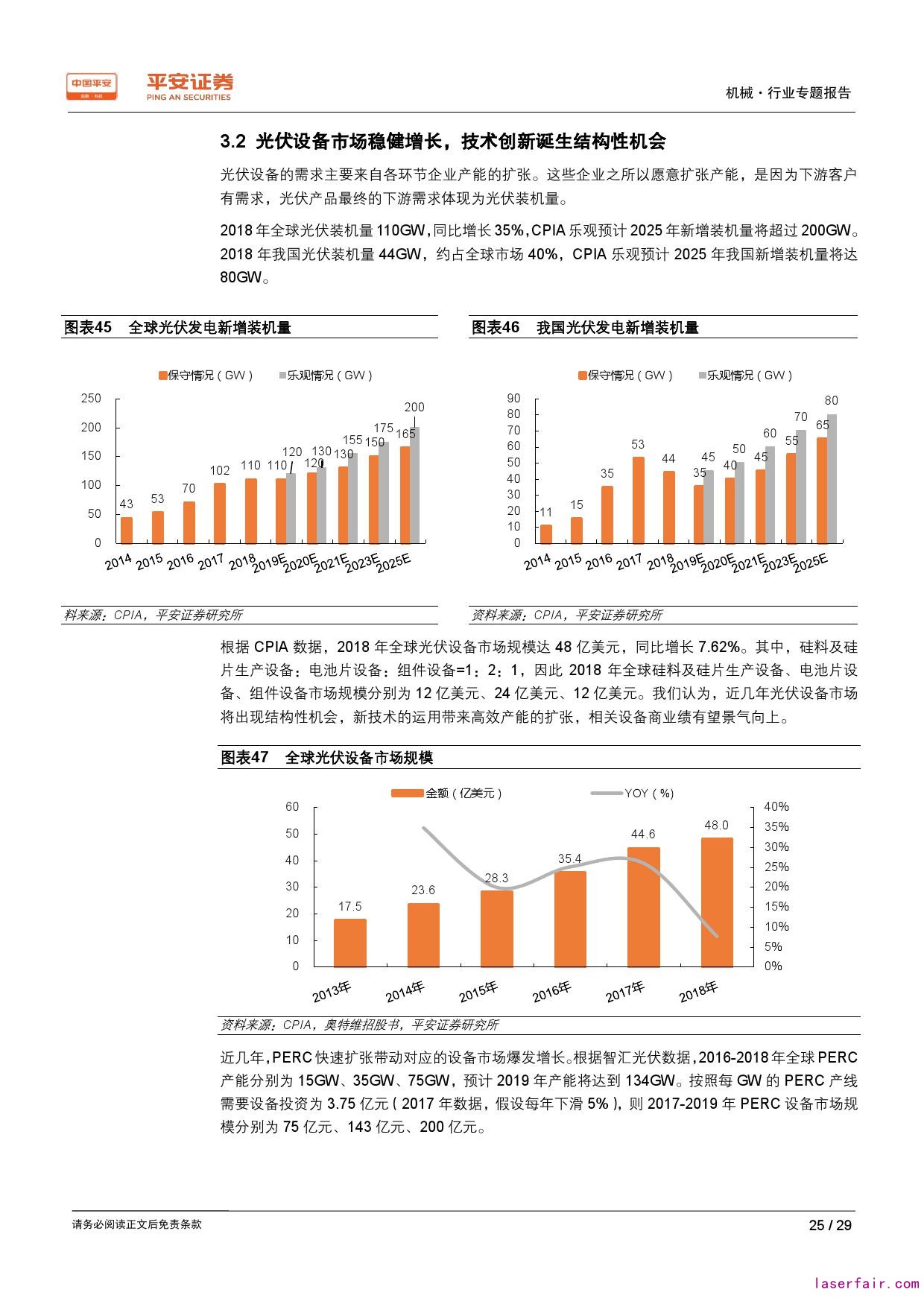 高效電池產能擴張,設備公司機遇多。預計2019年我國硅料、硅片、電池片、組件分別擴張產能約20萬噸、36GW、50GW、20GW,均以高效電池產能為主。2018年全球光伏設備市場總規(guī)模達48億美元,同比增長7.62%。預計2019年全球PERC電池片設備市場規(guī)模達200億元,其中背鈍化設備、自動化設備、絲網(wǎng)印刷設備占比最高,分別為43億元、43億元、23億元。我們認為,未來幾年光伏設備市場將出現(xiàn)結構性機會,高效電池的設備商業(yè)績有望景氣向上。