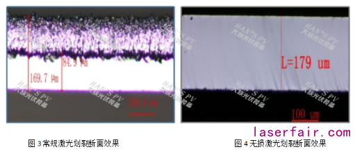 常規(guī)激光劃裂在電池表面燒蝕形成的切割道:寬度為30μm、深度為60-90μm,同時(shí)表面橫向熱影響區(qū)會(huì)擴(kuò)展到80μm左右,截面形貌如圖3,50%左右截面存在熱損傷;而無損激光劃裂的硅片截?cái)嗝娓蓛?、不存在損傷點(diǎn),主要原因是無損劃裂過程不存在激光高溫?zé)g過程。