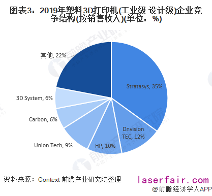 設計級和工業(yè)級3D打印設備,合計占所有3D打印機銷售收入的78%以上,在這兩個領域中,2019年的總發(fā)貨量下降了3%。金屬3D打印機的發(fā)貨量比2018年增長了+ 4%,但其中保持穩(wěn)定增長的是材料擠出和定向能量沉積類3D打印設備,而粉末床熔融設備的出貨量下降了10%。在金屬3D打印領域,從打印機銷量來看市場份額,進入前5名的企業(yè)有GE Additive、EOS、Desktop metal、Markforged、HBD(漢邦科技)。與2018年相比,工業(yè)級和設計級塑料3D打印機的整體出貨量下降了-5%,但包括HP和UnionTech(聯(lián)泰科技)在內(nèi)的部分設備制造商實現(xiàn)了增長。