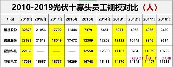截止2019年末,7家企業(yè)員工規(guī)模達萬人以上,3家企業(yè)在20000人以上,分別為隆基股份(32873人)、通威股份(23635人)和晶澳科技(22162人)。