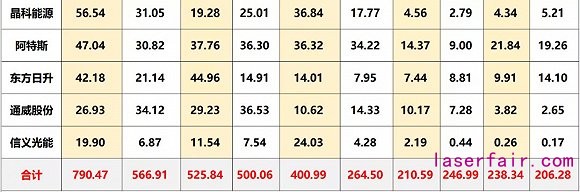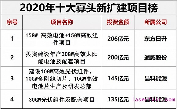 其中,單個項目投資規(guī)模在100億元就有6個,投資方分別是東方日升(投資206億元)、通威股份(200億元)、晶科能源兩個項目上榜,投資額分別為145億元和135億元,晶澳科技(102億元)、隆基股份(100億元)。