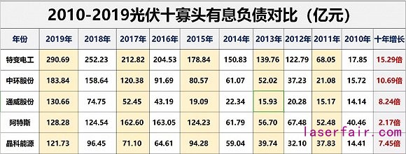 如下表所示,截止2019年末有5家光伏寡頭有息負債規(guī)模在100億元以上;十年間10大寡頭有息債務(wù)增長都在1倍以上,4家企業(yè)增長在10倍以上。