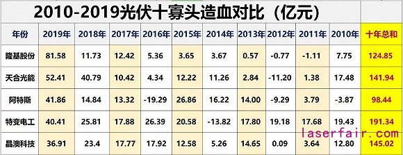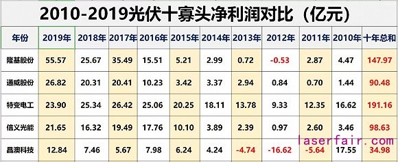 十年間,這10大光伏寡頭凈利潤累計達755.98億元,其中特變電工、隆基股份凈利潤在100億元以上(分別為191.16億元和147.97億元),高居前兩位,第三名為信義光能(98.63億元)。