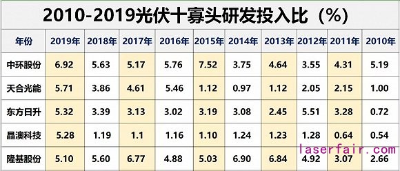 當然,任何企業(yè)也都會有自身的發(fā)展隱憂。據(jù)黑鷹光伏統(tǒng)計,截止2019年末這10大寡頭有息債務(wù)已達歷史新高的1201億元,是十年前的5.76倍,而它們貨幣資金儲備僅為790億元,兩者間存在411億元的資金缺口;另據(jù)統(tǒng)計10寡頭十年內(nèi)研發(fā)投入合計為386億元,十年間增長了13.49倍,但研發(fā)投入比僅為2.74%,仍處于較低水平。