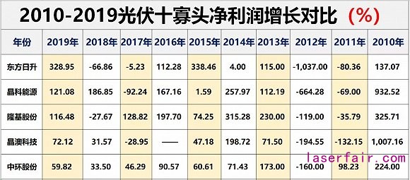 從成長速度來看,十年間有6大寡頭凈利潤實現(xiàn)翻倍增長,其中通威股份、隆基股份、中環(huán)股份增長都在10倍以上,分別增長了17.63倍、11.43倍和10.16倍。而晶澳科技、天合光能則出現(xiàn)倒退,兩者2019年凈利潤分別較2010年下降了26.84%和65.97%。