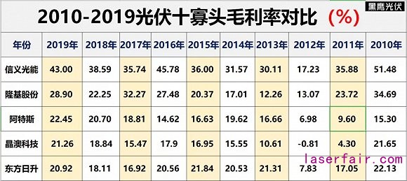 從產(chǎn)品盈利能力(毛利率)來看,在過去的十年間,信義光能毛利率一直位列十大寡頭之首,近四年(2016-2019年)隆基股份毛利率一直居于第二位,兩者產(chǎn)品盈利能力遠超他人。