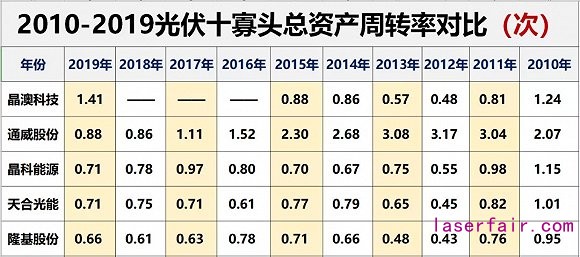 據(jù)黑鷹光伏統(tǒng)計,十年間,只有晶澳科技總資產(chǎn)運營效率略有增長,其他9大寡頭均出現(xiàn)不同程度下降,2019年總資產(chǎn)周轉(zhuǎn)率前三名企業(yè)為晶澳科技(1.41次)、通威股份(0.88次)和晶科能源(0.71次)。
