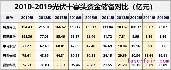 接下來,我們再來看一下各企業(yè)的資金儲備情況。統(tǒng)計數(shù)據(jù)顯示,10大寡頭貨幣資金儲備規(guī)模已經(jīng)連續(xù)6年增長,截止2019年末,10大寡頭資金儲備都在10億元以上,2家企業(yè)在100億元以上,分別為特變電工(194.43億元)、隆基股份(193.36億元)。